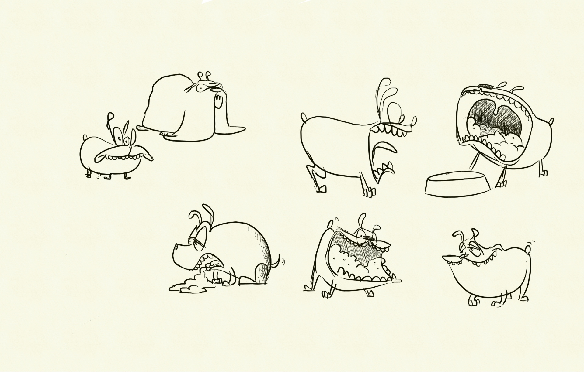 Before I started animating I did a few more exploratory sketches in the computer — the dog character at the bottom right ended up being (more or less) the model. The two at top left are what happens when my brain forgets what I am doing and where I am…